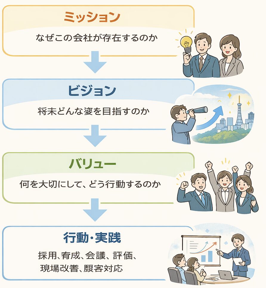 会社を経営していると、ふと立ち止まって考える場面があります。「自社は何のためにあるのか」「これからどこを目指すのか」「社員にどんな考え方で動いてほしいのか」 こうしたことを言葉にしたものが、ミッション・ビジョン・バリューです。 最近は、採... 生産性向上